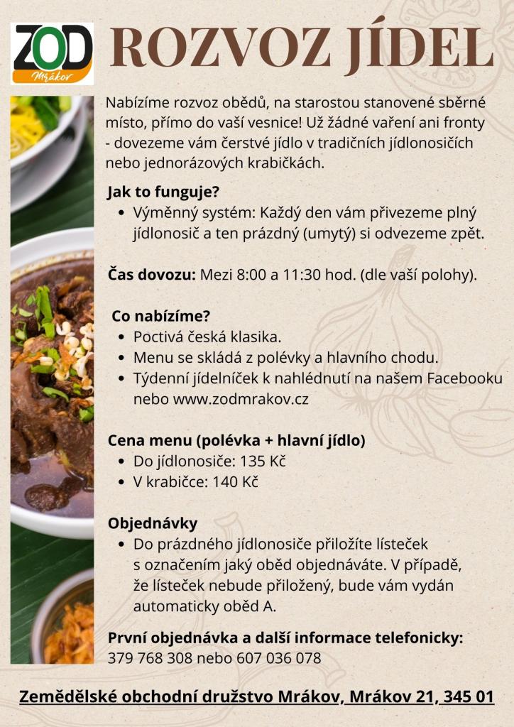 Zemědělské obchodní družstvo Mrákov nabízí rozvoz obědů přímo do vaší vesnice. Systém funguje na výměnném principu, kdy každý den přivezeme plný jídlonosič a odvezeme prázdný. Objednat si můžete českou klasiku, která zahrnuje polévku a hlavní chod. Cena za menu je 135 Kč do jídlonosiče a 140 Kč v jednorázové krabičce. Pro více informací a objednávky nás můžete kontaktovat na telefonu 379 768 308 nebo 607 036 078.